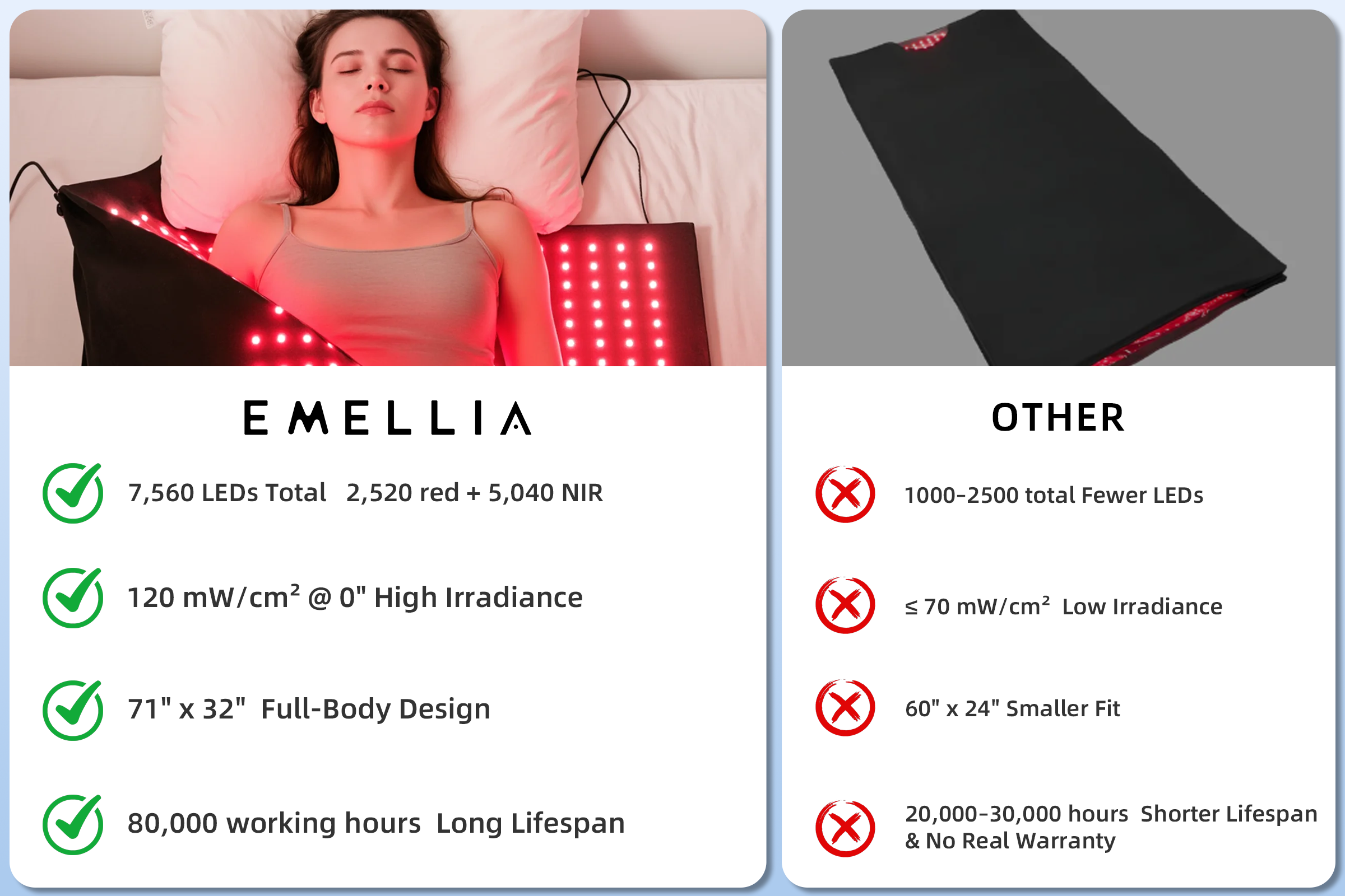 Our LED Bag is equipped with 2,520 premium LEDs, each combining two 850nm and one 660nm lights. Engineered for optimal red and near-infrared light delivery, it provides consistent, even coverage with an irradiance of 120mW/cm² — ideal for promoting relaxation and overall wellness.