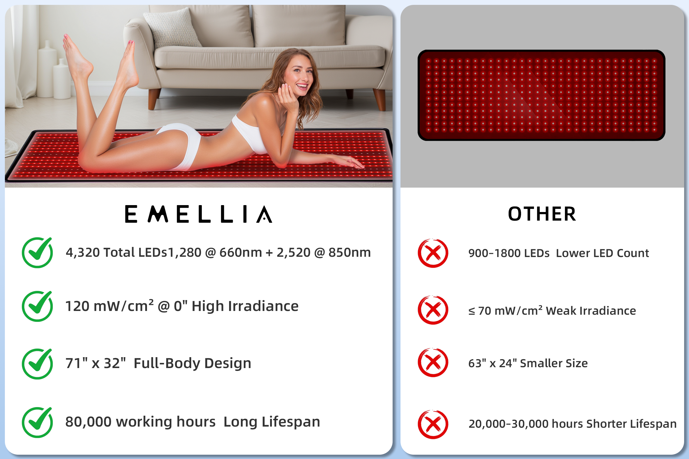 Designed with 1,280 high-quality LEDs, the Emellia LED Mat offers a soothing blend of 850nm and 660nm light. With strong yet gentle irradiance of 120mW/cm², it promotes full-body relaxation and daily well-being.